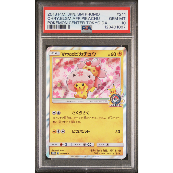 Pikachu Cherry Blossom (211/SM-P) Japanese PSA10 is a highly collectible promo card renowned for its unique artwork and limited availability. The card was originally released in 2018 as a Tokyo DX Pokémon Center exclusive, featuring Pikachu with a cherry blossom (sakura) afro to celebrate the hanami (cherry blossom viewing) tradition in Japan.